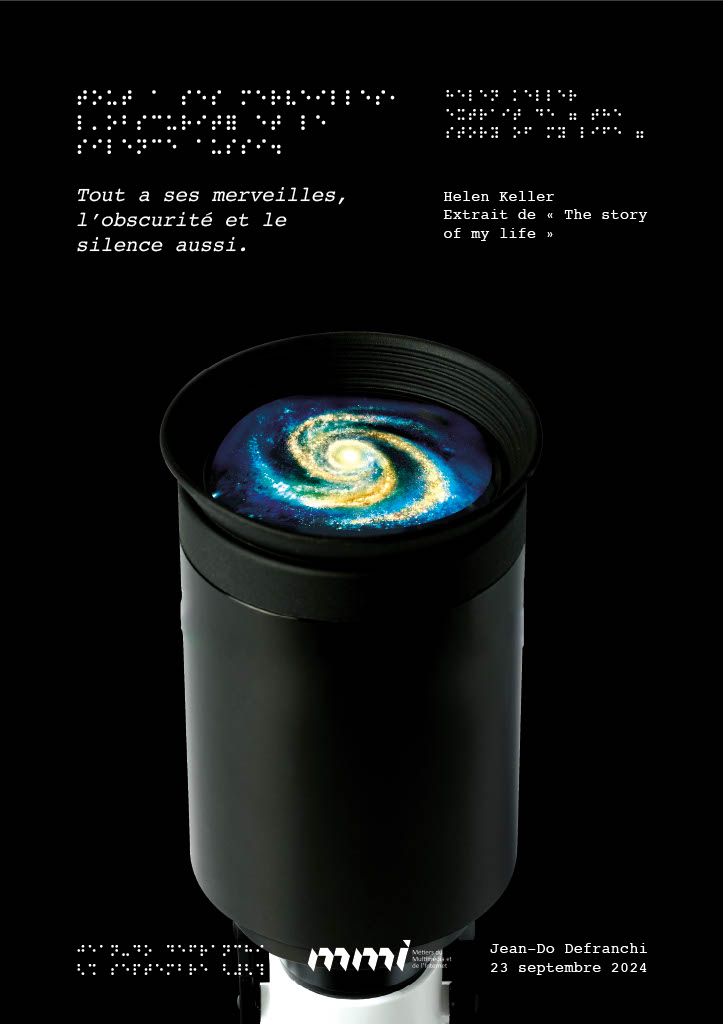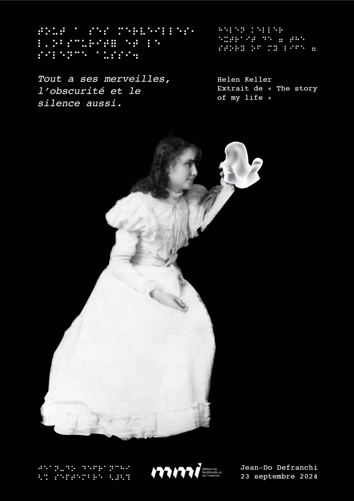 J'ai proposé une première piste pour la citation, cette dernière étant composée de trois choses : l’obscurité, le silence et les merveilles. Ainsi j’ai décidé de représenter l’obscurité avec la nuit et un ciel noir ; le silence en lien avec l’espace, où il y a un silence absolu ; et les merveilles avec une galaxie observée au travers de l’oculaire d’un télescope.Cette proposition est une représentation très littérale de cette citation. Il n’y a pas d’élément faisant écho à l’autrice de cette phrase, Helen Keller. Pour la seconde proposition j'ai choisi de rappeler l’histoire de son autrice, j’ai alors recherché des informations sur sa vie. Helen Keller est née en 1880, elle était une femme sourde et aveugle, à la suite d’une maladie qu’elle eue étant nourrisson. Elle est la première personne atteinte de ce handicap à obtenir un diplôme universitaire. Elle a écrit plusieurs livres, donnait des conférences et elle était également militante politique. C’est une jeune éducatrice d’une école pour aveugle, Anne Sullivan, qui lui a appris le braille, la langue des signes, la lecture, à parler et à écrire. Anne lui esquissait des signes dans la paume de sa main avant de lui présenter un objet pour lui apprendre le nom des choses. Ainsi j’ai décidé de représenter quelque chose en lien avec la texture, qui pourrait être reconnu au touché mais qui visuellement n’aurait pas vraiment d’intérêt, comme une paréidolie. J’ai donc représenté une fleur mais composée de cartons, de papier déchiré, de plastique... L’aspect visuel n’est pas très attirant comparé à une vraie fleur mais une personne aveugle pourrait créer cet assemblage pour représenter une fleur qu’elle aurait touché et donc communiquer. Pour cette dernière proposition j’ai décidé de rendre aussi hommage à Anne Sullivan, l’éducatrice de Helen, en représentant Helen en train de toucher un visage (celui d’Anne) mais comme elle découvre le monde par le touché j’ai représenté le visage avec uniquement des courbes dessinant les volumes/reliefs du visage.Pour ces propositions j’ai choisi deux typographies. La première est une typographie en braille afin de rendre hommage à Helen Keller et aux personnes aveugles ou malvoyantes. La deuxième est une typographie mécane, Courier, que j’ai mis en italique pour la citation et que j’ai laissé verticalement pour le nom de l’autrice. J’ai fait ce choix car Helen a appris à écrire sur une machine à écrire, où les typographies étaient des mécanes, donc Courier correspondait parfaitement que ce soit sur l’aspect temporel ou sur le lien avec l’histoire de Helen Keller.