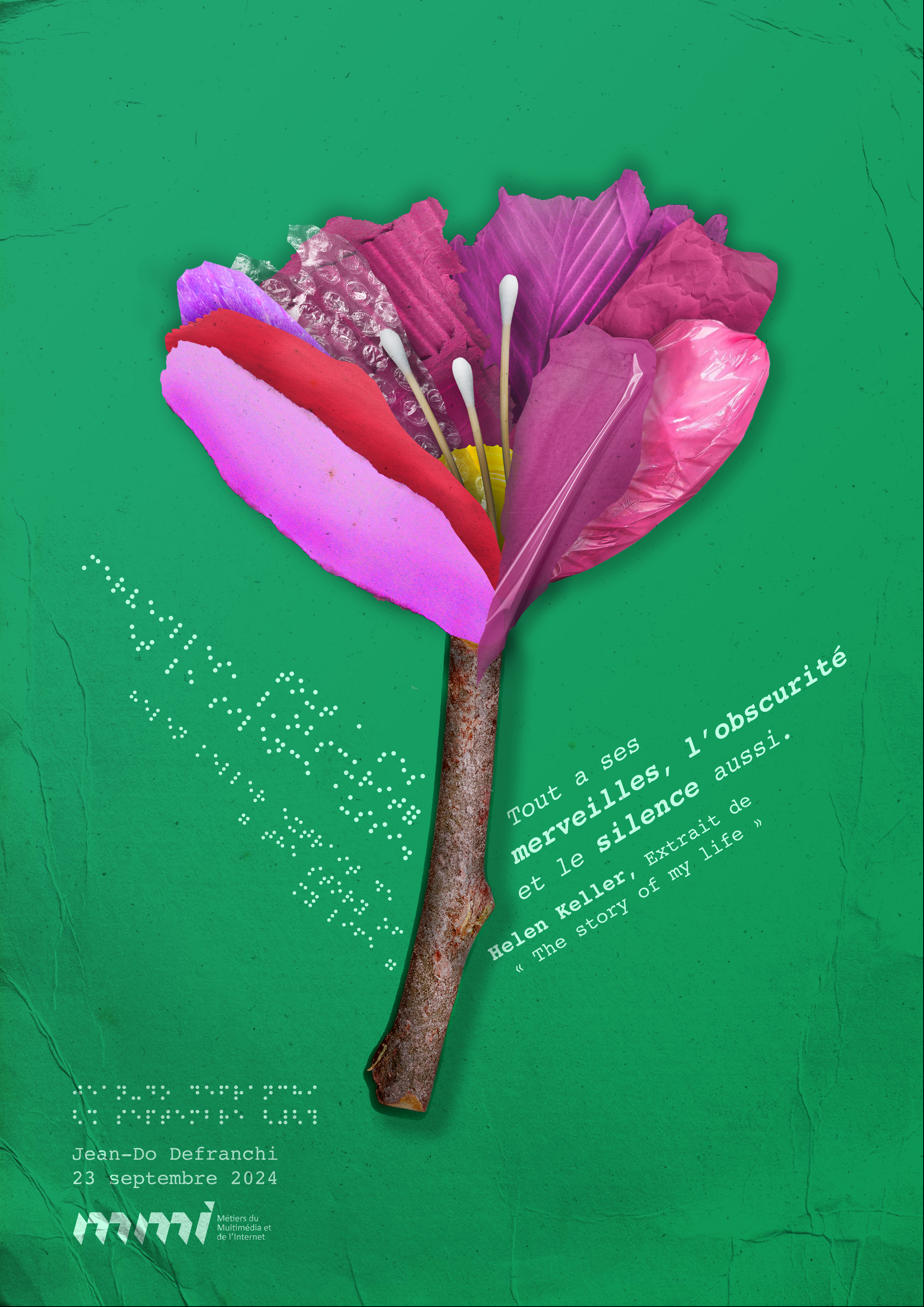 J’ai fini par choisir d’aboutir la proposition 2 car elle permettait une représentation efficace de la citation. Pour représenter cette fleur, constituée de matériaux que l’on pourrait reconnaitre par le toucher (plastique, papier, carton...) et qui ne sont pas visuellement très attirant, j’ai composé mon affiche en m’inspirant du travail de Michal Batory. En effet, j’ai placé les éléments, composant la fleur, légèrement inclinés vers la droite pour permettre avec la courbe de la « tige » un sens de lecture du haut vers le bas renvoyant vers l’angle en bas à gauche où se trouve mon nom et le logo du département MMI, clôturant l’affiche. J’ai mis en forme la citation pour représenter les feuilles de la plante, accrochées à la tige des deux côtés. Ainsi le texte est décliné en braille et se place sur la gauche et le texte classique sur la droite. J’ai choisi un fond en dégradé de vert pour contraster avec le rose des « pétales ». J’ai coloré en rose ces éléments afin de donner un côté plus merveilleux à cette fleur, que les personnes passant à côté puissent voir une « belle fleur » dès le premier coup d’œil.