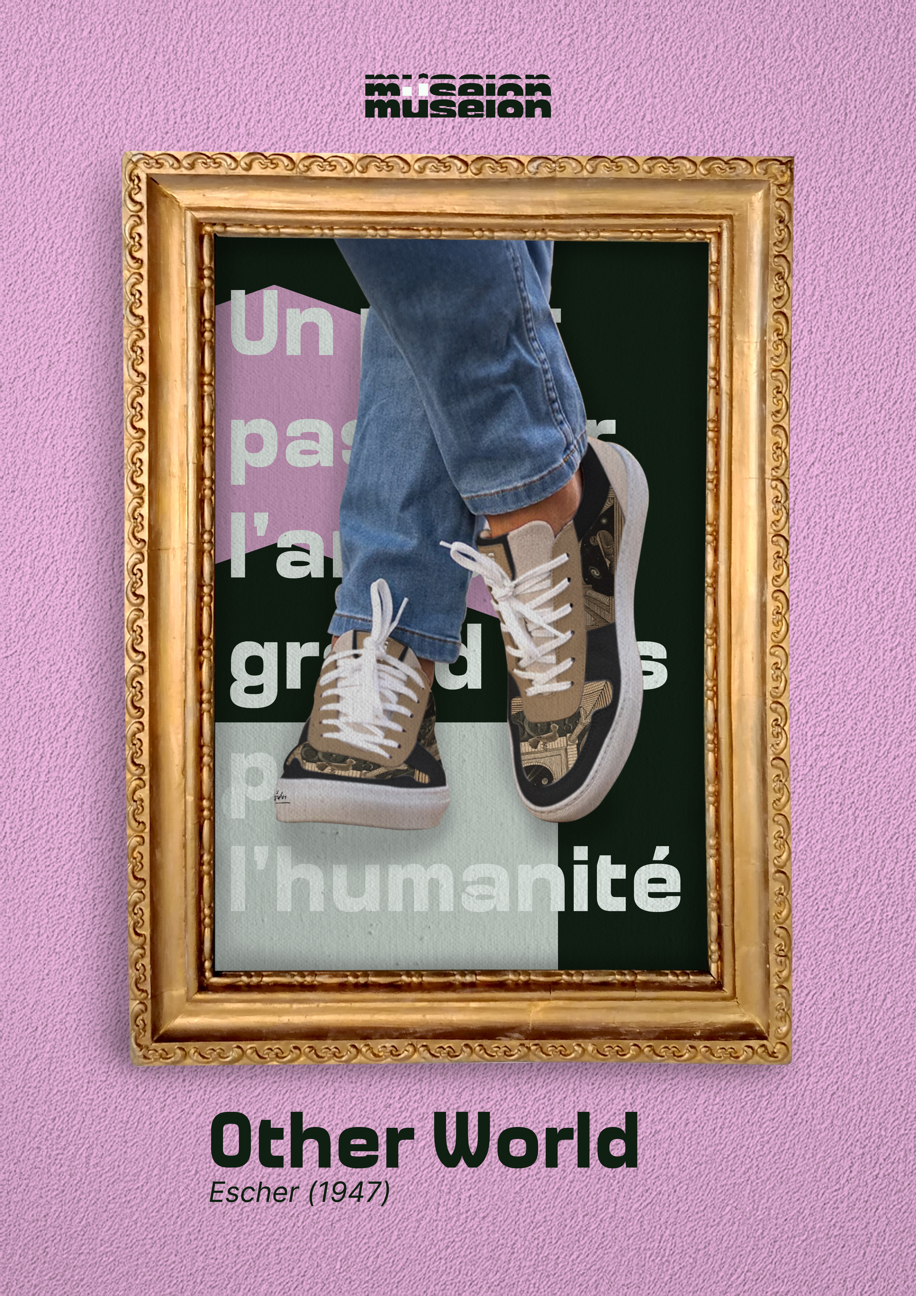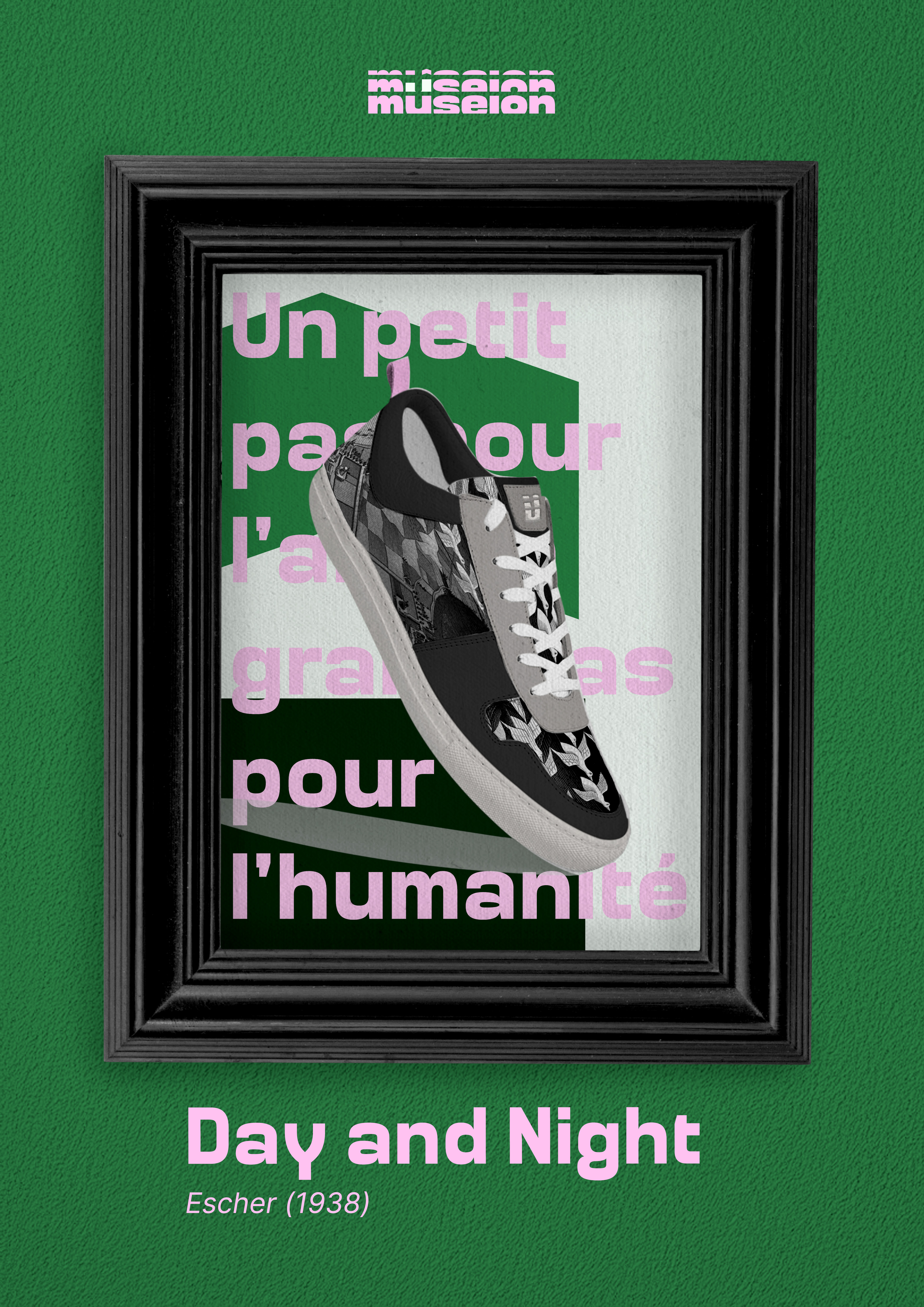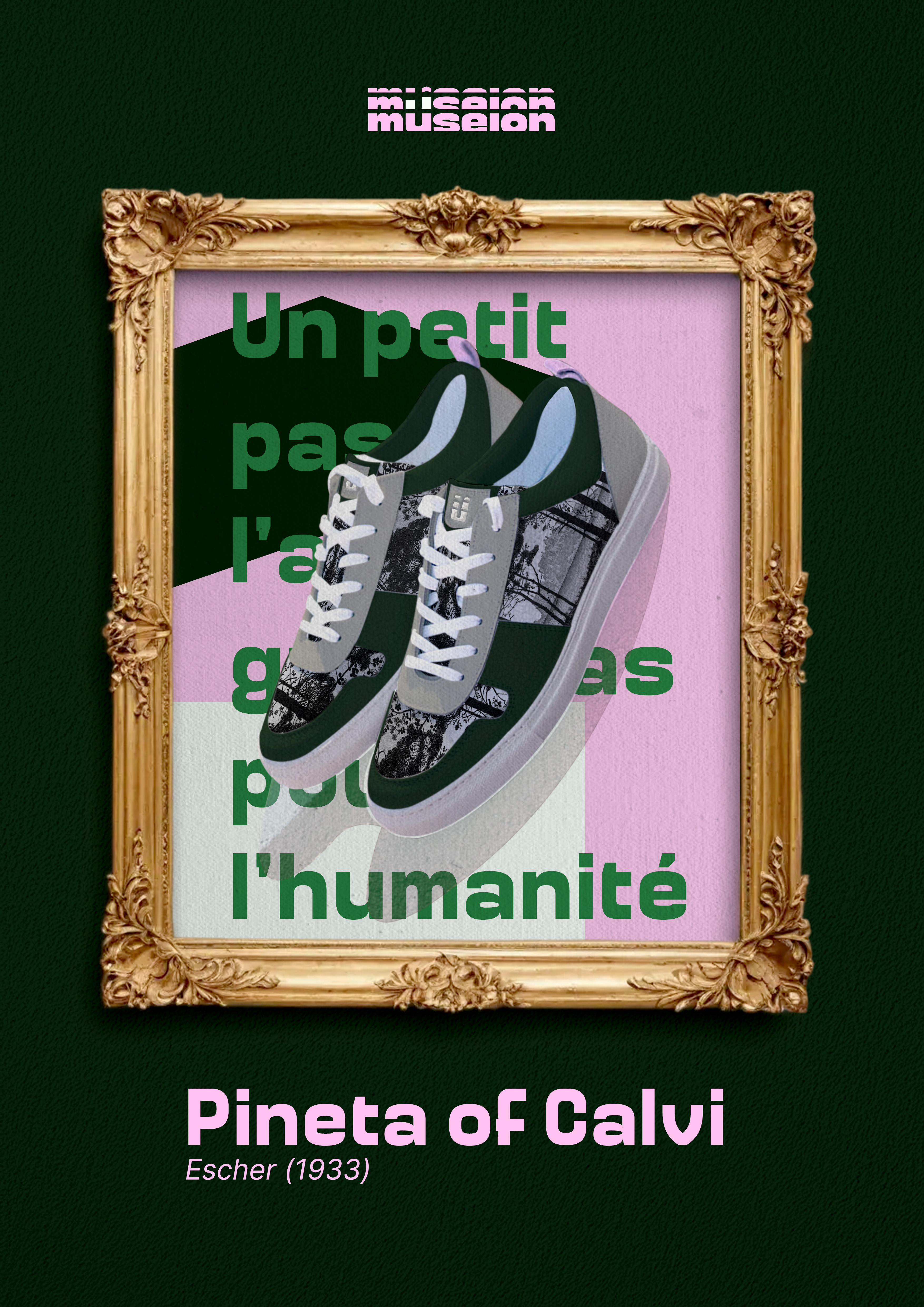 J'ai ainsi créé la marque Museion (en hommage aux 3 muses grecques d'origine), qui a pour but de redonner de la curiosité aux personnes en fabriquant des œuvres à porter qui permettent de diffuser l'art différemment. "Un petit pas pour l'art, un grand pas pour l'humanité". À travers ce message on reprend la fameuse phrase de Neil Armstrong, premier homme à avoir posé le pied sur la lune en 1969, « C’est un petit pas pour l’homme mais un bond de géant pour l’humanité ». Enfin j'ai créer les modèles des chaussures et les visuels pour les réseaux sociaux.