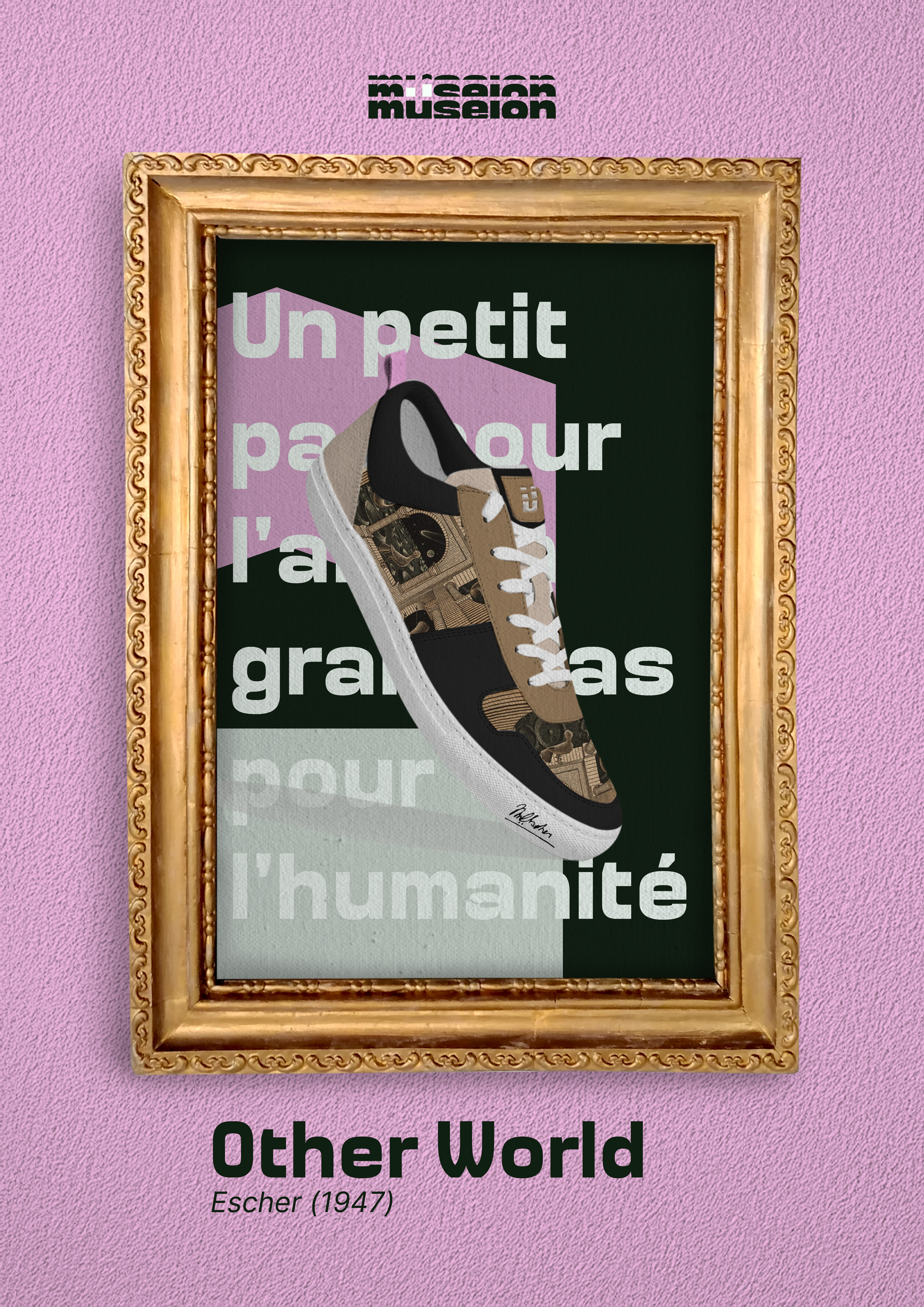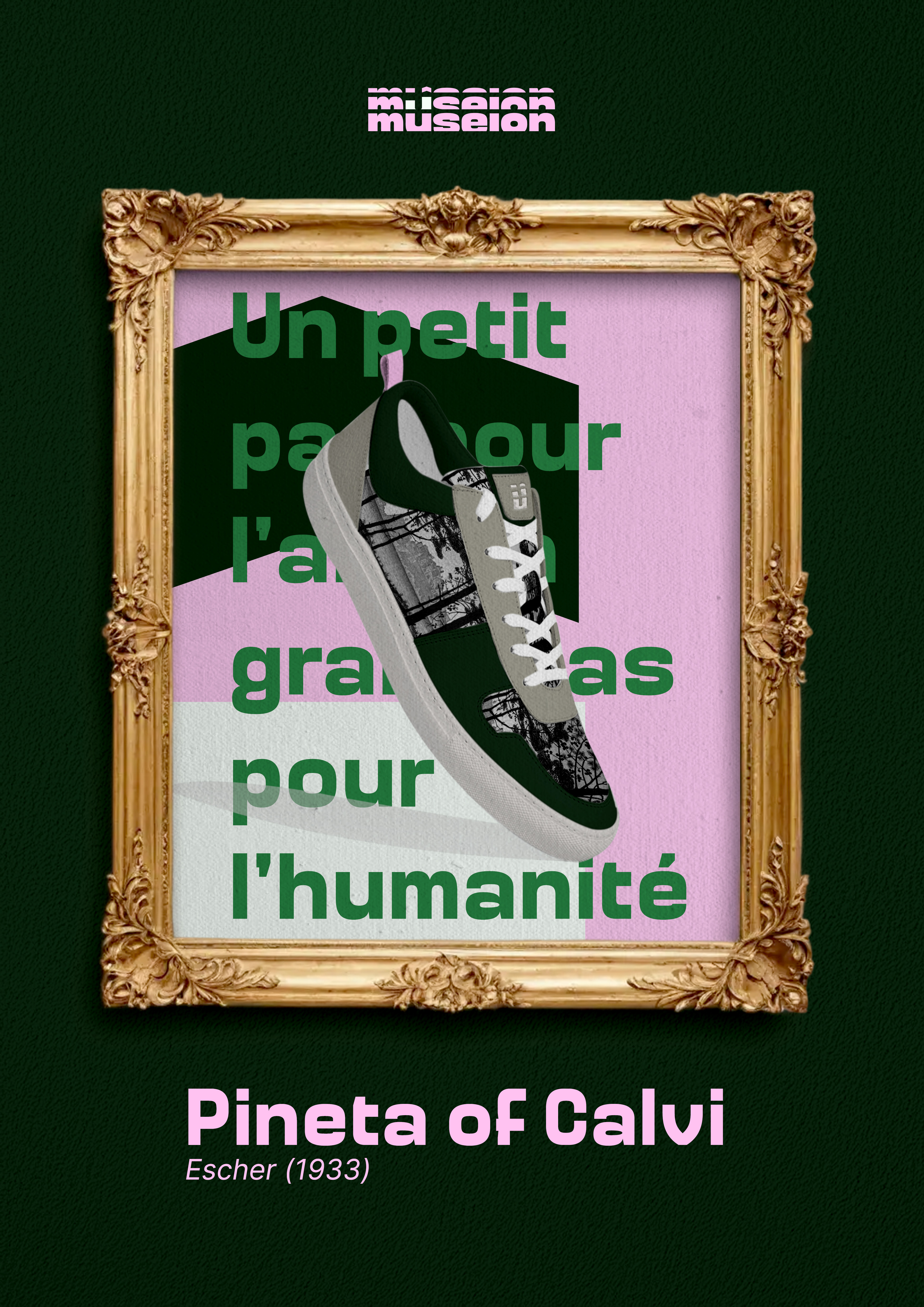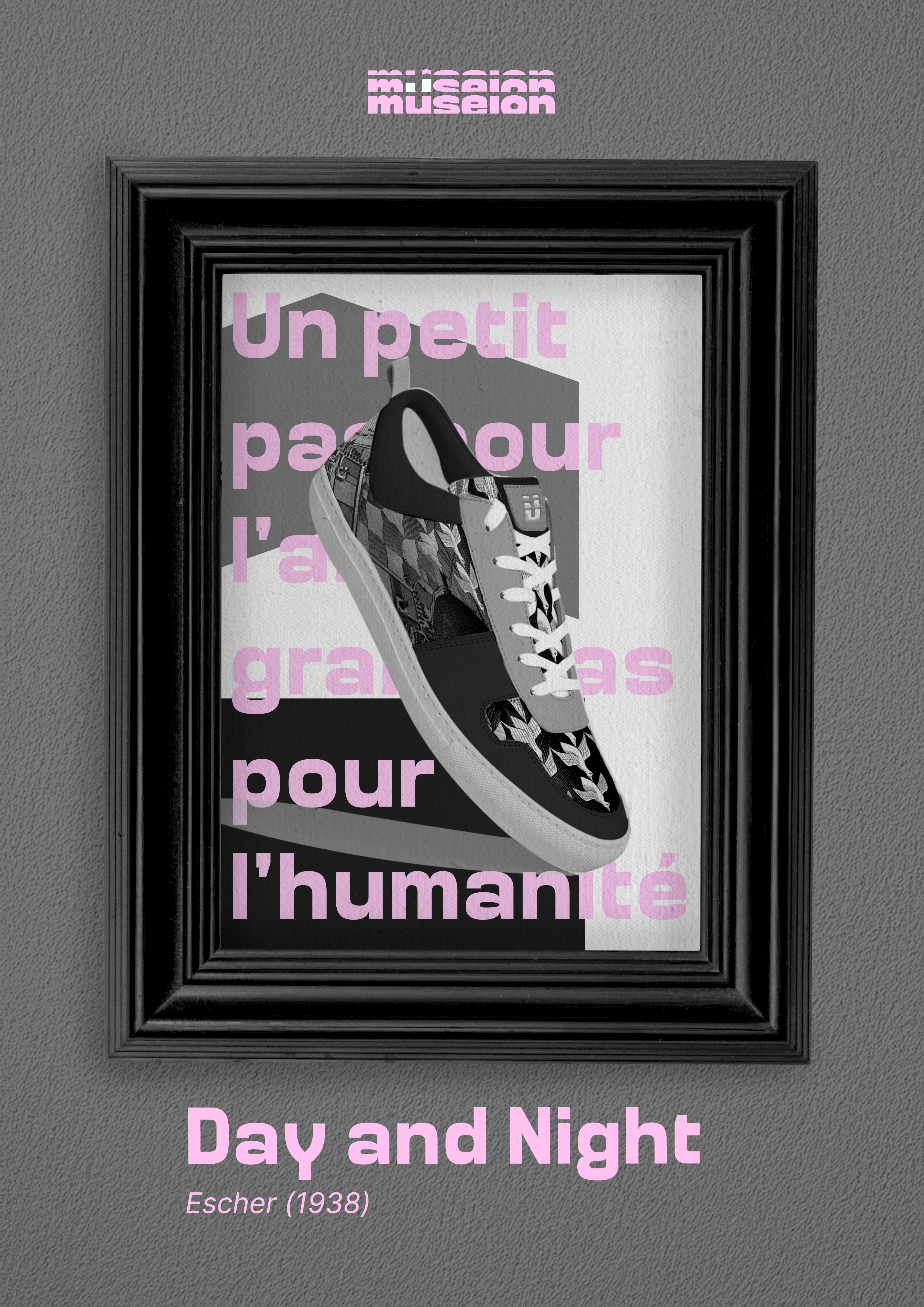 J'ai ainsi créé la marque Museion (en hommage aux 3 muses grecques d'origine), qui a pour but de redonner de la curiosité aux personnes en fabriquant des œuvres à porter qui permettent de diffuser l'art différemment. "Un petit pas pour l'art, un grand pas pour l'humanité". À travers ce message on reprend la fameuse phrase de Neil Armstrong, premier homme à avoir posé le pied sur la lune en 1969, « C’est un petit pas pour l’homme mais un bond de géant pour l’humanité ». Enfin j'ai créer les modèles des chaussures et les visuels pour les réseaux sociaux.